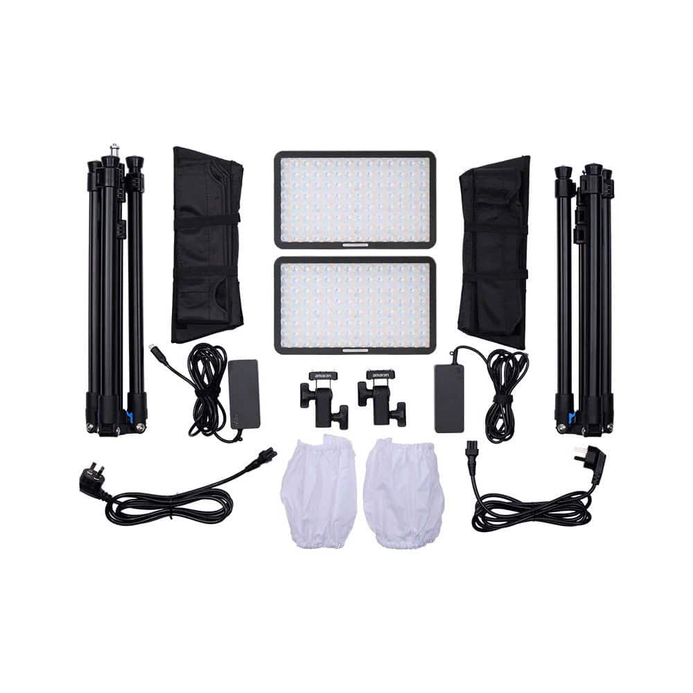 Bộ Kit Hoàn chỉnh: Bộ 2 đèn đi kèm chân đèn, hộp mềm, lưới kiểm soát ánh sáng, bộ khuếch tán, adapter gắn đèn, bộ nguồn và túi đựng bảo vệ, sẵn sàng cho mọi dự án sáng tạo.