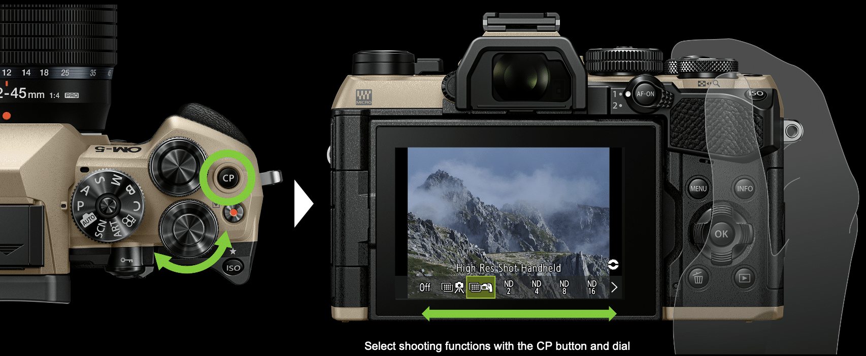 Máy ảnh OM SYSTEM OM-5 Mark II với nút CP chuyên dụng, người dùng có thể truy cập nhanh loạt tính năng nâng cao, biến những kỹ thuật hậu kỳ phức tạp thành thao tác chụp đơn giản: