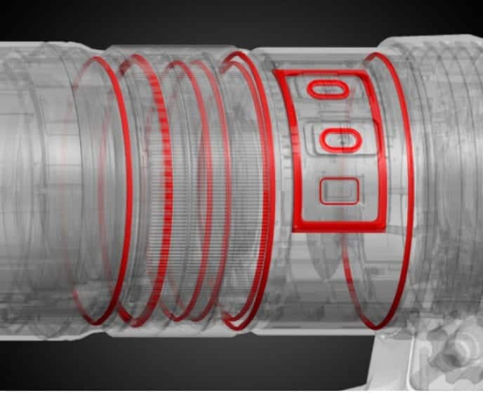 Cấu trúc quang học tinh xảo với 3 thấu kính Super ED, 3 HR và 1 E-HR giúp loại bỏ quang sai và viền màu ở tiêu cự siêu dài. Công nghệ tráng phủ Z Coating Nano giảm thiểu lóe sáng, bóng ma, đảm bảo hình ảnh sắc nét, trong trẻo ngay cả khi ngược sáng.